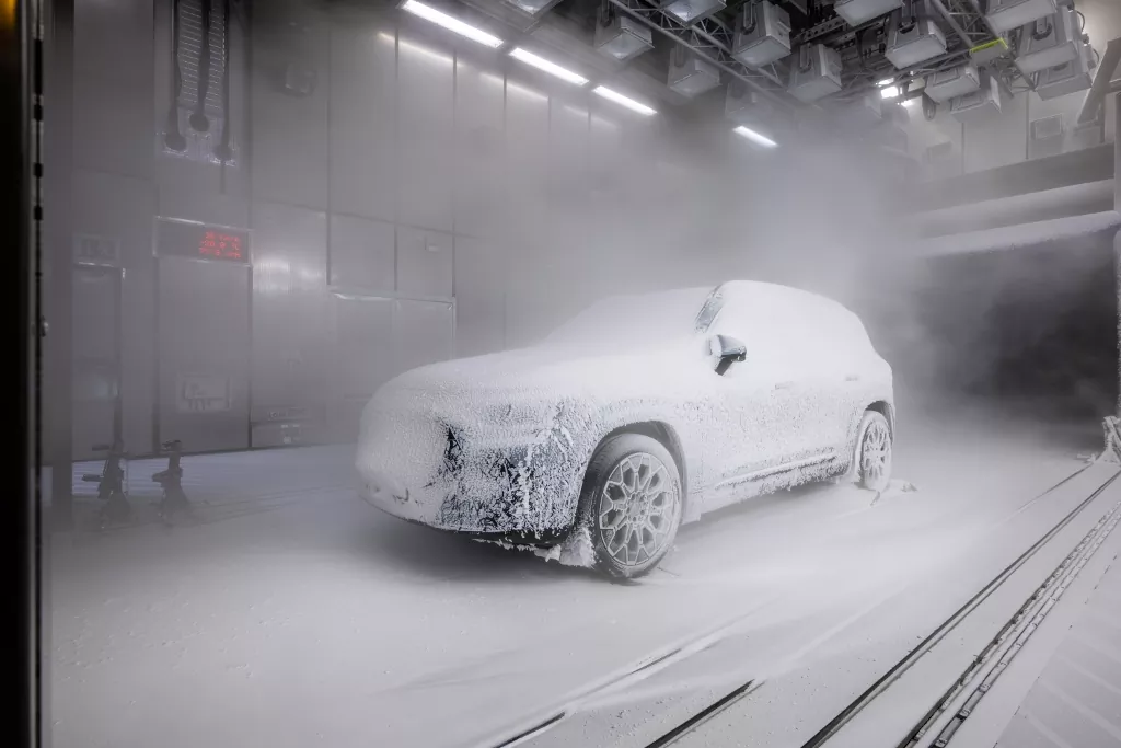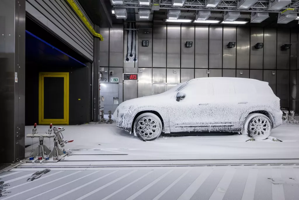 V špeciálnych klimatických komorách Mercedesu prechádza nový GLB testami, ktoré simulujú reálne, ale aj mimoriadne extrémne podmienky. V takzvanom „cold tunnel“ sa teploty pohybujú od -40 do +40 °C, čo pokrýva prakticky všetky možné poveternostné situácie na planéte.