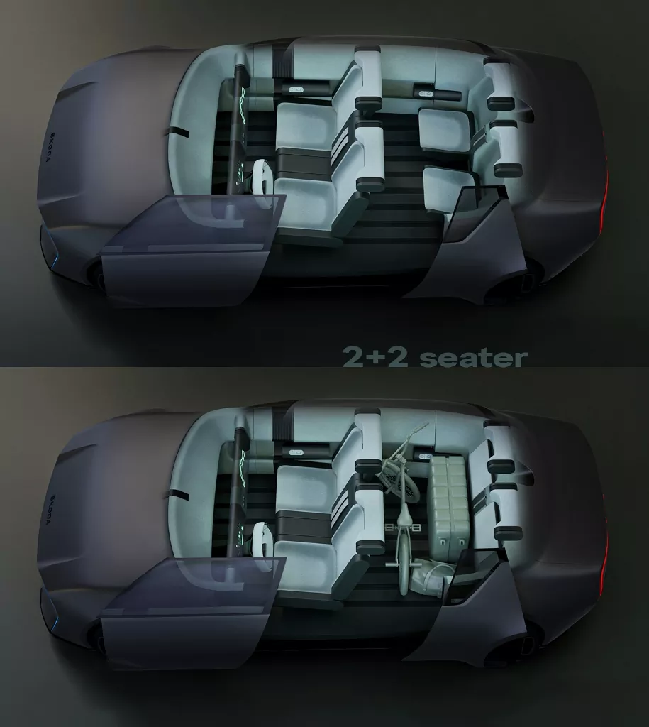 Nová vízia 1000 MBX pôsobí ako elegantný crossover v štýle Modern Solid. Interiér je usporiadaný v konfigurácii 2+2 — predné sedadlá vytvárajú pohodlnú lavicu, zadné sú samostatné s výklopnými sedákmi inšpirovanými kinom. Dvere otvárané proti sebe uľahčujú nástup a vyklopením zadných sedákov vznikne veľký úložný priestor vhodný aj pre bicykel.