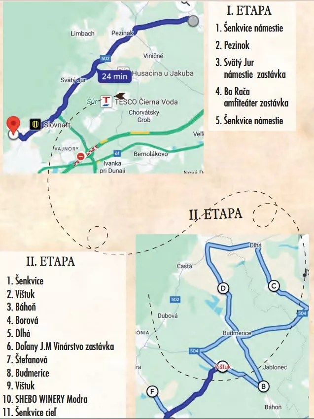 Trasa: Šenkvice → Pezinok → Svätý Jur (zastávka a ochutnávka vín) → Rača – Amfiteáter (občerstvenie a degustácia) → návrat do Šenkvíc na obed